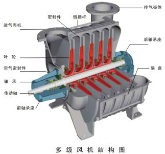 機(jī)殼材料采用HT250鑄件,經(jīng)過時(shí)效和熱加工處理,保證強(qiáng)度及材料分子結(jié)構(gòu)的穩(wěn)定性。機(jī)殼的主要部件由進(jìn)氣機(jī)殼、中間隔盤、排氣機(jī)殼組成,它們采用橡膠密封圈密封,并通過煤油滲漏試驗(yàn),保證氣體不泄露。葉輪出口處設(shè)有擴(kuò)壓器,進(jìn)口處設(shè)有回流器,保證鼓風(fēng)機(jī)效率。為適應(yīng)各種不同所需壓力和流量,鼓風(fēng)機(jī)級(jí)數(shù)可采用2級(jí)-10級(jí)壓縮。進(jìn)、出氣口位置根據(jù)用戶的需要,電機(jī)可以安裝在進(jìn)氣端;也可以安裝在排氣端;法蘭面既可垂直向上,也可水平向左。